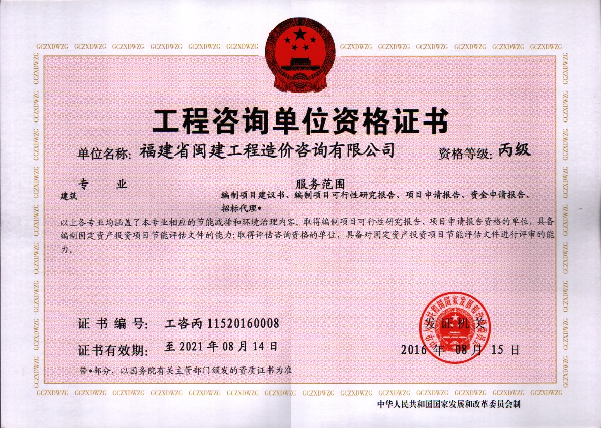 福建省閩建工程造價咨詢有限公司成立于1993年,原隸屬福建省建設(shè)委員會,2001年脫鉤改制為有限責(zé)任公司,公司注冊資本1200萬元,是一家具有甲級工程招標(biāo)代理資質(zhì)(證書編號:F135000429)、甲級工程造價咨詢資質(zhì)(證書編號:甲150135000084)、政府采購代理資質(zhì)、預(yù)備級中央投資項(xiàng)目招標(biāo)代理機(jī)構(gòu)資質(zhì)(證書編號:ZYTZ-C2013239)、丙級工程資質(zhì)(證書編號:工咨丙11520160008)的綜合性工程咨詢服務(wù)單位。能承擔(dān)各類建設(shè)項(xiàng)目的工程招標(biāo)代理、工程造價咨詢...